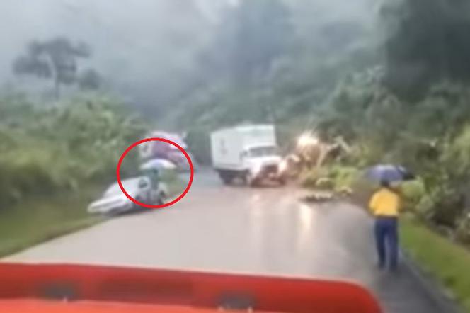 Gdy auto wpada w poślizg przy małej prędkości, trudno wyobrazić sobie co mysli kierowca. Pojazd sunie po lodzie jak po maśle, a kierowca tylko czeka na uderzenie. Bezsilność i sekundy ciągnące się w nieskończoność. Finał takich sytuacji z reguły bywa przykry i skutkuje koniecznością naprawy auta. Tu jednak sytuacja potoczyła się zupełnie inaczej. Jeden z obserwatorów widowiskowego poślizgu ciężarówki postanowił się przed nią obronić... parasolem. To nie mogło się udać! Ale jako, że wyjątek potwierdza regułę, tym razem się udało.