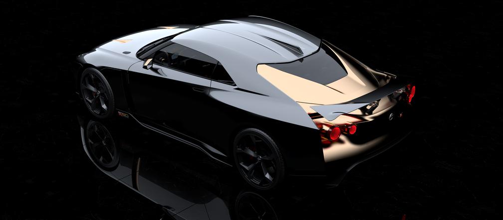 Podwójne okrągłe tylne lampy GT‑R zostały przeprojektowane jako osobny „pływający” element z wąskimi pierścieniami emitującymi światło i wklęsłymi środkami. Klosze lamp stanowią łącznik między zewnętrznymi wzmocnieniami a centralną części struktury bagażnika. Całości dopełnia duży, regulowany tylny spojler oparty na dwóch wspornikach. Specjalne obręcze kół — o rozmiarze 21×10 cali z przodu oraz 21×10,5 cala z tyłu — podkreślają bezkompromisową sylwetkę pojazdu. Z szarością lakieru Liquid Kinetic Gray kontrastują złote „rocznicowe” akcenty w kolorze Energetic Sigma Gold.