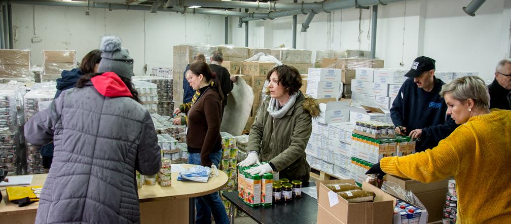 W paczkach znajdują się m.in. groszek z marchewką, biała fasola, koncentrat pomidorowy, sok jabłkowy klarowany oraz powidła śliwkowe. Nie brakuje także mleka, żółtego sera i konserw, w tym szynki drobiowej, filetów z makreli w oleju. Są również takie produkty, jak cukier, olej rzepakowy, makaron czy ryż.