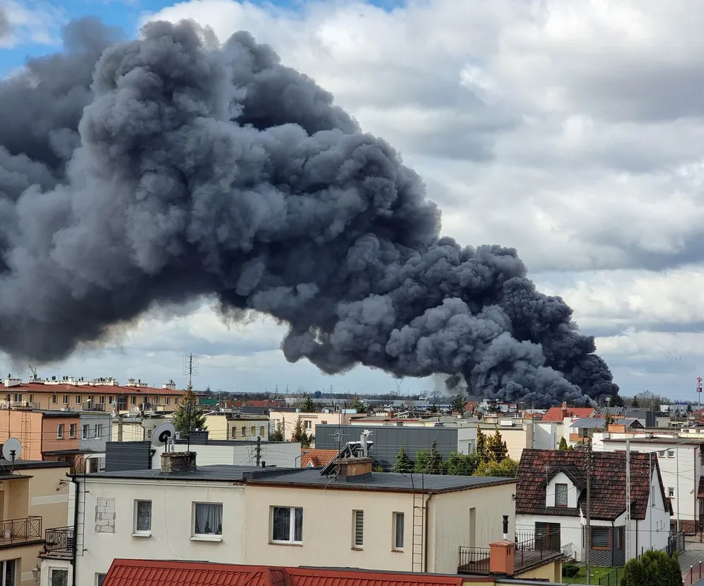 Ogień zupełnie ogarnął dwie hale i zaczyna palić się kolejna. Strażacy starają się opanować pożar, akcję utrudnia duże zadymienie. W gaszeniu ognia biorą udział 24 zastępy strażaków.