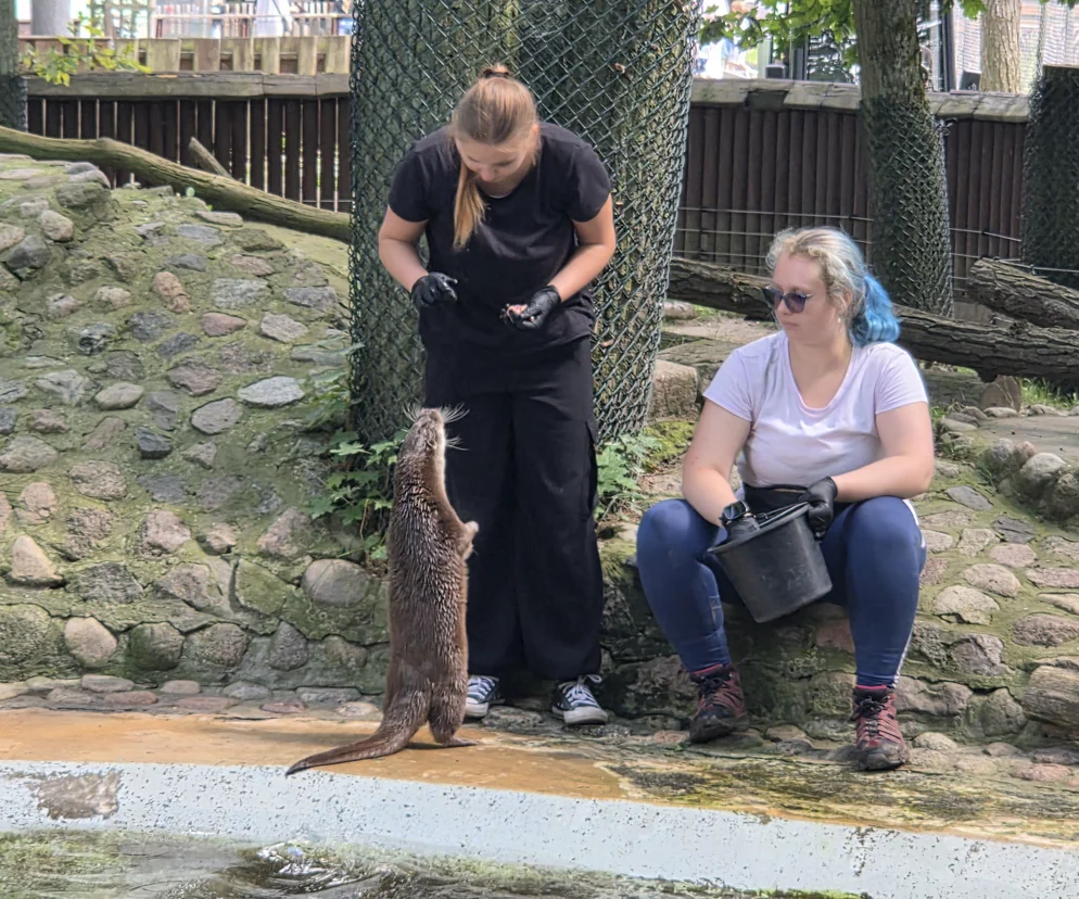 Kiedy zbliża się pora karmienia, w powietrzu czuć lekkie napięcie – i to nie tylko wśród gości. Jeżozwierze już kręcą się niespokojnie, lemury z ciekawością zerkają w stronę ścieżki, po której mają nadejść opiekunowie, a wydry… cóż, wydry w swoim stylu robią hałas, jakby chciały przypomnieć wszystkim, że to one dziś są gwiazdami.