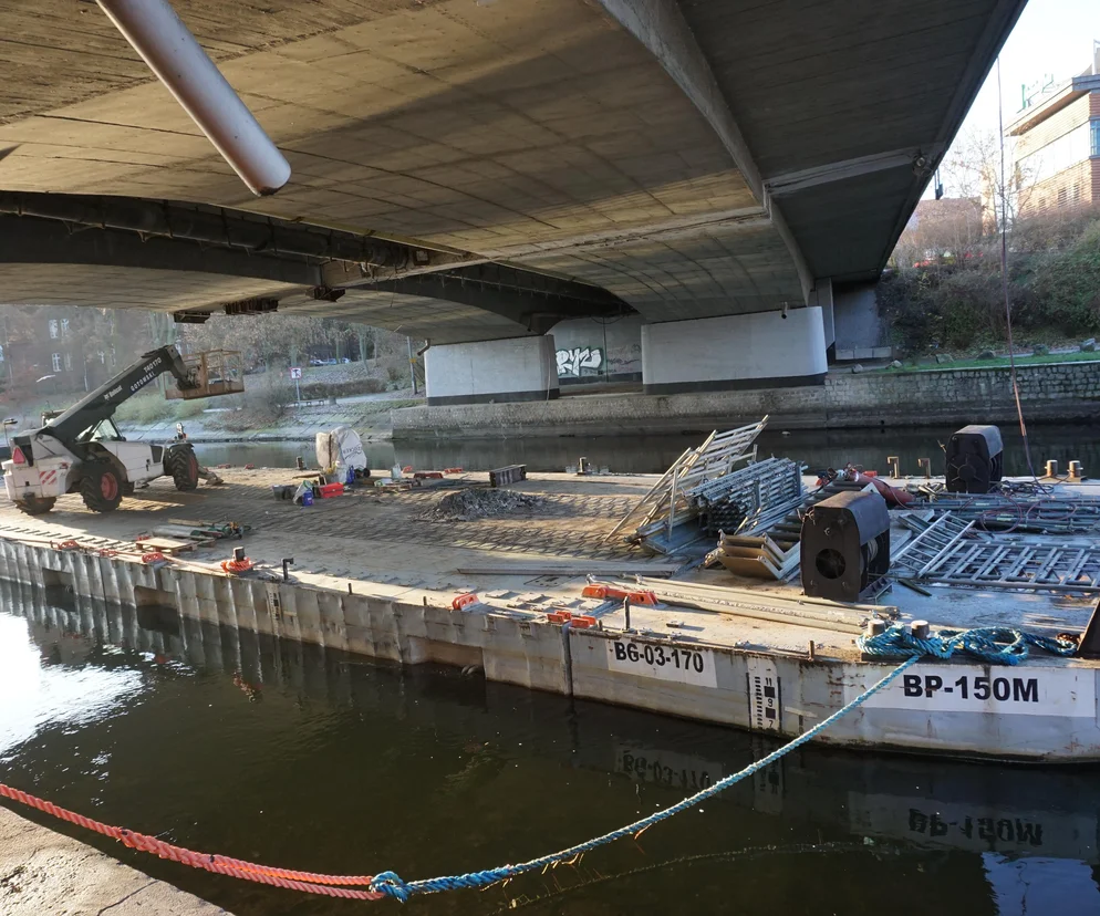 Prace trzeba przeprowadzić także od spodu przęsła, dlatego od 6 listopada przy Brdzie zacumowała barka, która umożliwia dostęp do konstrukcji w rejonie przegubów.