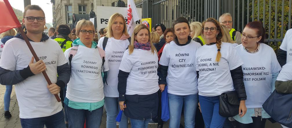 Część z nich zarabia mniej niż ich koledzy w innych województwach. Z transparentami przyszli przed Urząd Wojewódzki w Bydgoszczy. - Nie wydaje się nam, że pracujemy gorzej. Wykonujemy dokładnie te same zadanie w całym kraju, a tylko my jesteśmy traktowani gorzej - mówili protestujący.