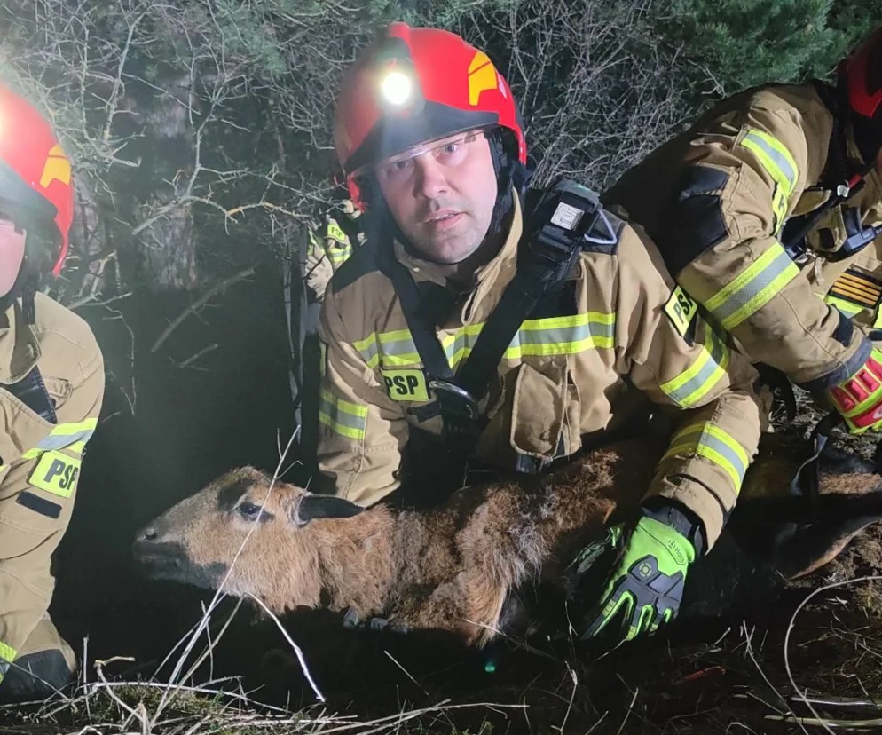 Po dotarciu do zwierzęcia strażak zabezpieczył je i ostrożnie sprowadził na dół. Cała akcja wymagała dużej precyzji i spokoju, aby nie przestraszyć jeszcze bardziej zwierzęcia.
