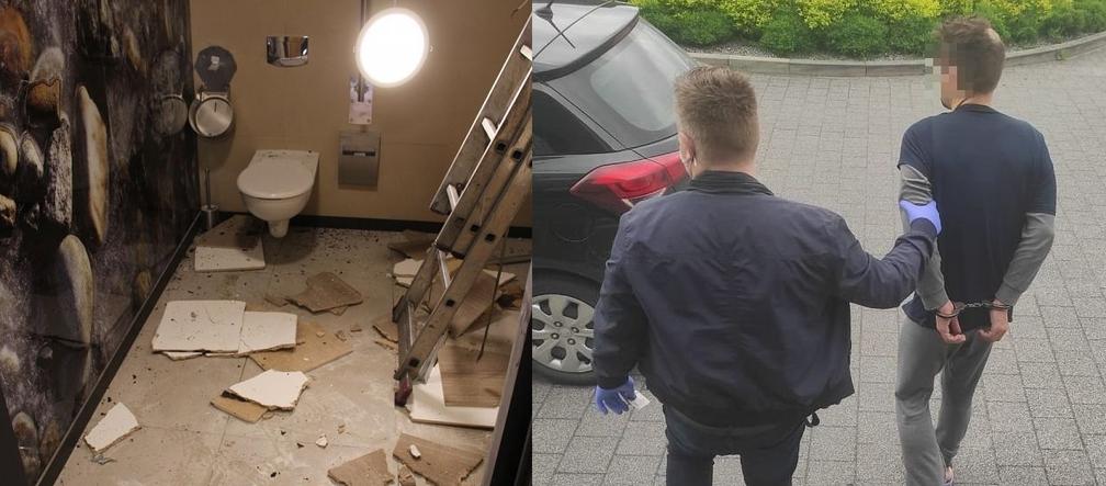 Do zdarzenia doszło w poniedziałek (17 maja). Jak relacjonuje policja w Skarżysku-Kamiennej 32-letni obywatel Bułgarii przyszedł do sklepu jednej ze stacji paliw na terenie miasta, zrobił niewielkie zakupy i zaczął się awanturować. Następnie zamknął się w toalecie i zaczął ją demolować. - Wyrwał z sufitu kasetony, po czym wszedł pomiędzy dach a aluminiową konstrukcję podwieszonego sufitu. Kiedy przemieszczał się tamtędy, pod jego ciężarem zarwały się elementy sufitu i mężczyzna spadł do innego pomieszczenia - podaje Jarosław Gwóźdź, oficer prasowy skarżyskiej policji.