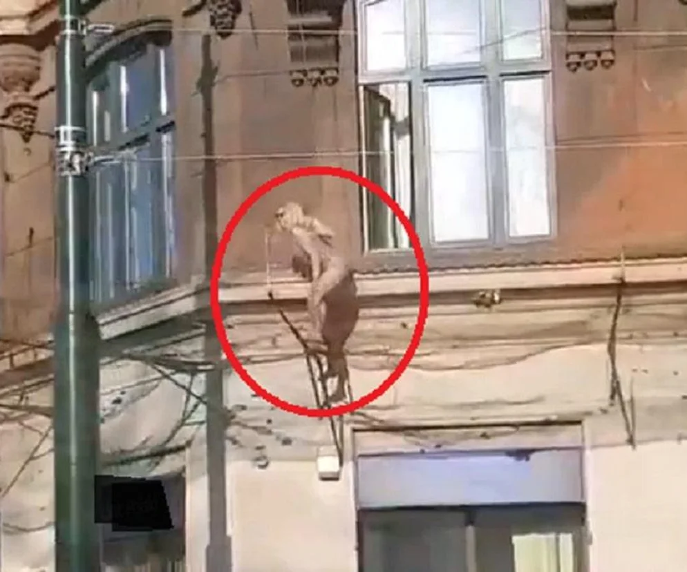 W skąpym stroju spacerowała po gzymsie kamienicy