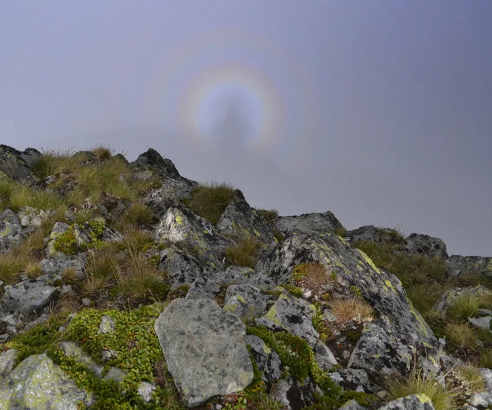 Widmo Brockenu to zjawisko optyczne, które można zaobserwować właśnie w wysokich partiach gór, albo np. lecąc samolotem. Może się pojawić, gdy znajdujemy się między słońcem i chmurami bądź mgłą. Właśnie wtedy nasz cień może przybrać wielką postać i być otoczony tęczową obwódką, zwaną glorią. W pierwszej chwili można się nawet… przestraszyć. Zapewne stąd inna nazwa widma Brockenu to mamidło górskie.