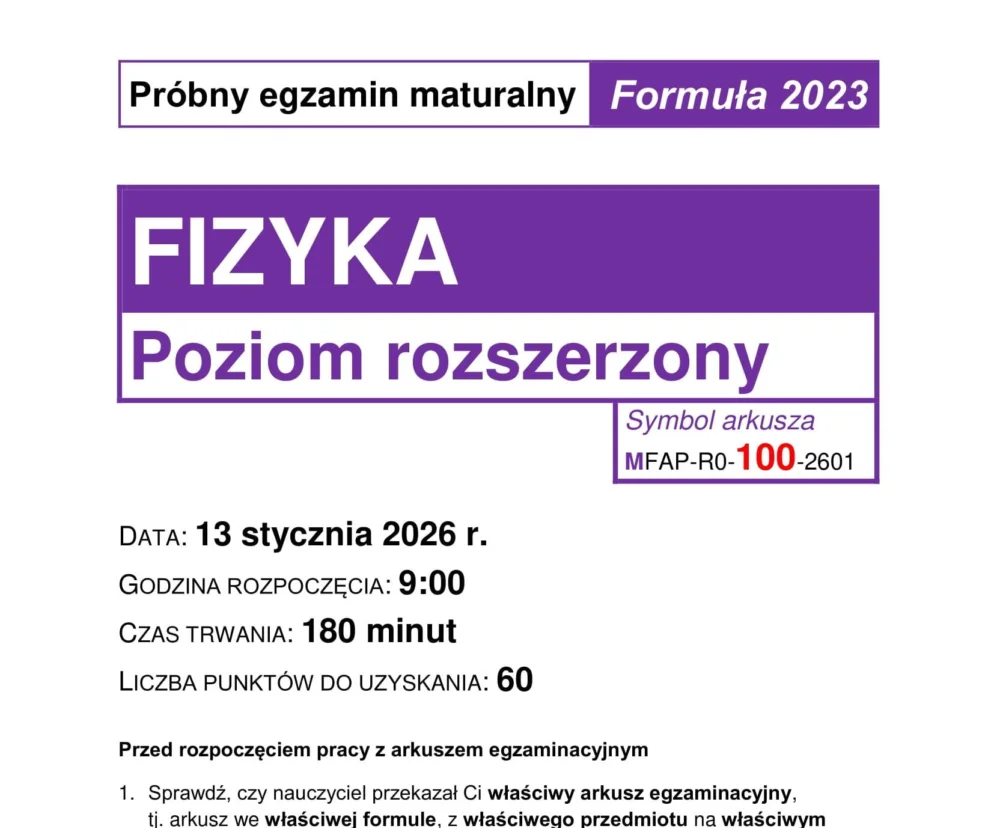 Próbny egzamin maturalny z fizyki na poziomie rozszerzonym odbędzie się 13 stycznia 2026 roku (wtorek) o godz. 9. Egzamin jest przeznaczony dla uczniów IV klasy liceum ogólnokształcącego, V klasy technikum oraz II klasy branżowej szkoły II stopnia i ma charakter dobrowolny. Materiały egzaminacyjne zostaną udostępnione szkołom oraz opublikowane na stronach CKE i okręgowych komisji egzaminacyjnych w dniu egzaminu, o godzinie jego rozpoczęcia. Z kolei zasady oceniania i rozwiązania zadań pojawią się najpóźniej następnego dnia. Arkusze CKE z próbnej matury 2026 z fizyki już są dostępne. Odpowiedzi zamieścimy już niedługo.