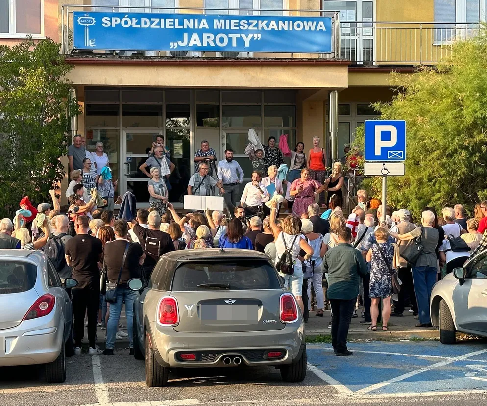 Mieszkańcy Spółdzielni Mieszkaniowej "Jaroty" z Olsztyna dostali gigantyczne rachunki. Niedopłaty sięgają nawet kilka tysięcy złotych. Zorganizowali się spontanicznie przed siedzibą spółdzielni z ręcznikami. Chcieli się wykąpać w siedzibie spółdzielni, jednak ich nie wpuszczono. Policja cały czas pilnowała zgromadzenia, na którym pojawiło się kilkaset osób. Tłum nie zmieścił się przed budynkiem. Niektórzy stali po drugiej stronie ulicy, jeszcze inni obserwowali zdarzenie z okien.