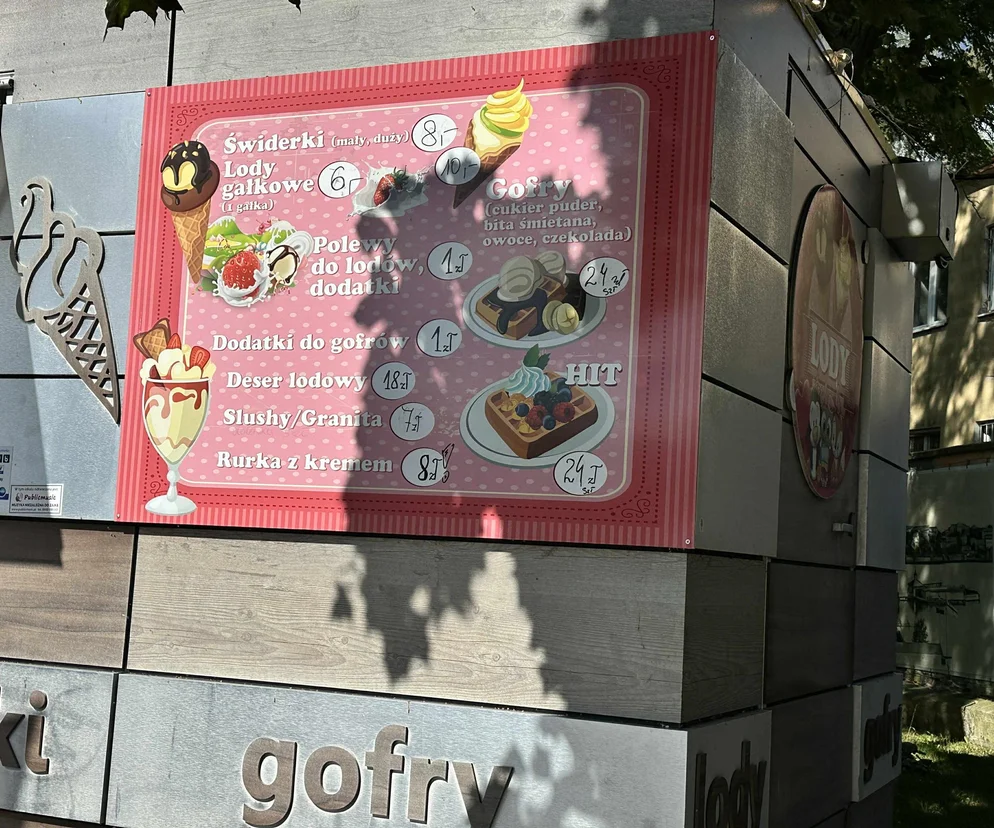 Menu przyklejone na ścianie budki też wygląda jak po małej rewolucji. Naklejki z nowymi cenami zasłaniają stare kwoty. Świderek kosztuje 8 zł, gałka lodów 6 zł, rurka z kremem 8 zł, granita 7 zł. Zestaw, który rok temu obciążał portfel, dziś wrócił do stawek sprzed pięciu lat.