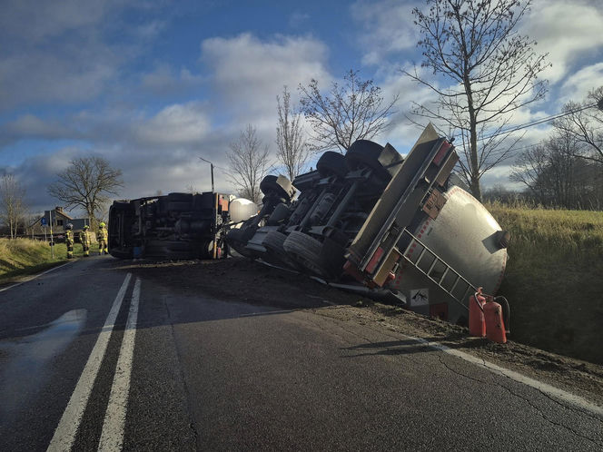 Cysterna przewróciła się na krajowej "szesnastce" pod Mrągowem (woj. warmińsko-mazurskie).