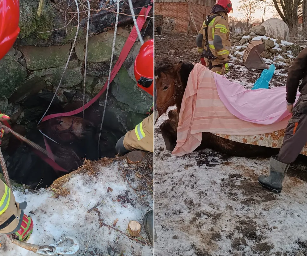 Strażaków z Giżycka wezwał na pomoc właściciel klaczy, która wpadła do starej kamiennej studni w pobliżu gospodarstwa. Zwierzę utknęło w wąskim szybie studziennym, na głębokości ponad trzech metrów. - Gdy strażacy przybyli na miejsce zdarzenia, właściciel poinformował, że zwierzę jest bardzo wystraszone i już dosyć zmęczone. Klacz w studni usadowiona była zadem na dnie, a głowa w nienaturalny sposób opierała się o ściany - poinformował st. kpt. Grzegorz Różański, rzecznik warmińsko-mazurskiej straży pożarnej.