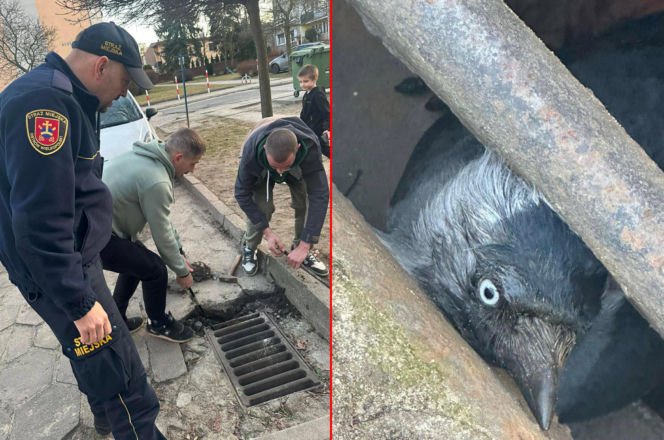 Kawka utknęła pod studzienką. Mieszkańcy i strażnicy ruszyli z pomocą