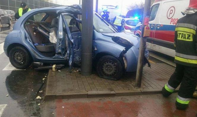 Wypadek na ul. Hlonda – nissan uderzył w słup sygnalizacji świetlnej