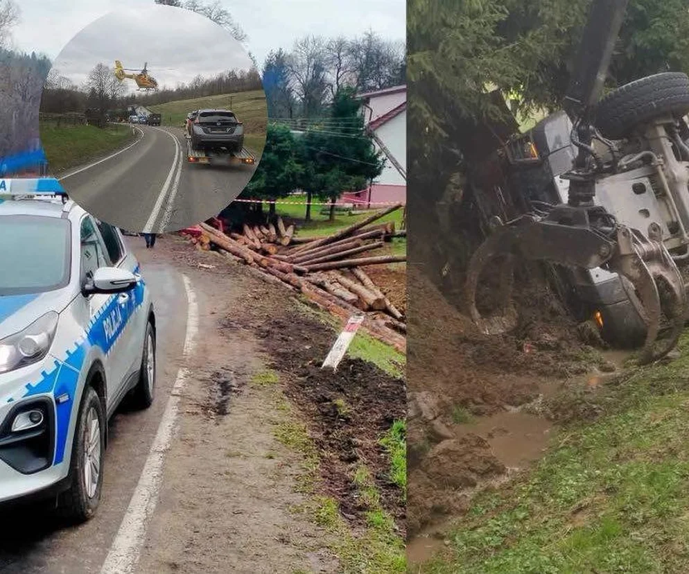 Podkarpackie. Dachowanie ciężarówki z drewnem. Kierowca utknął w kabinie