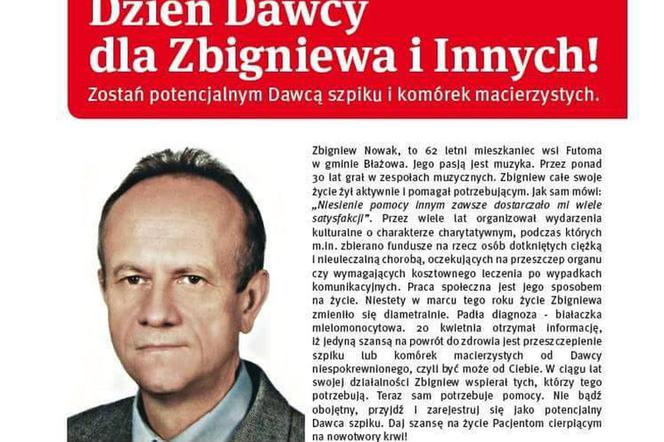 Zbigniew Nowak w marcu dowiedział się, że choruje na białaczkę. W kwietniu okazało się, że jedyną szansą na powrót do zdrowia jest przeszczep szpiku kostnego lub komórek macierzystych od dawcy niespokrewnionego.