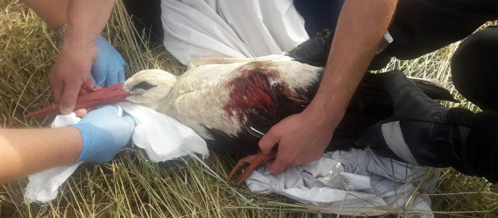 Zgłoszenie o rannym ptaku w Hucisku otrzymali wczorajszym porankiem kolbuszowscy policjanci. Gdy pojawili się na miejscu, okazało się, że spacerujący po ściernisku bocian biały jest ranny, a na jego skrzydłach widoczna jest krew. Przez tę kontuzję, nie mógł się on dostać do gniazda, gdzie czekały na niego głodne młode.