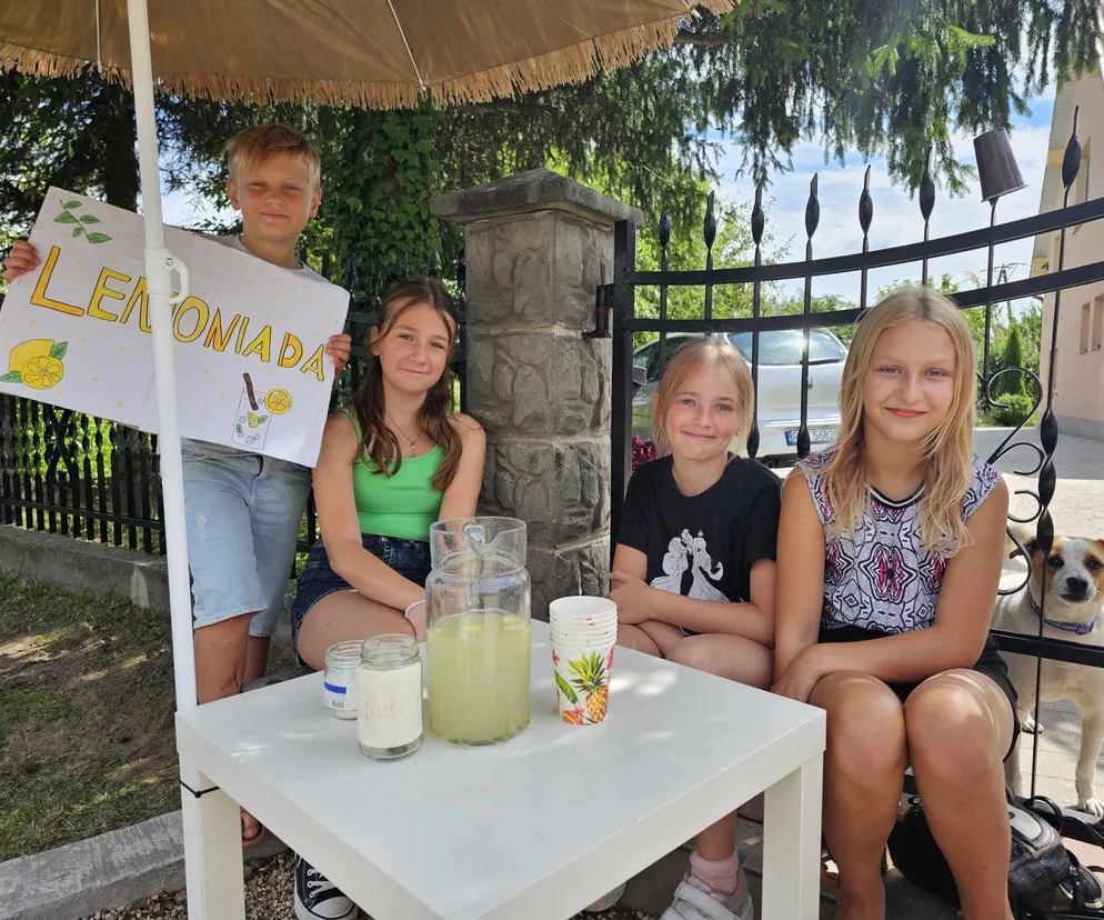 Emilka (11 l.) ze Szkoły Podstawowej nr 1 w Przeworsku, Roksi (11 l.) ze Szkoły Podstawowej nr 2 w Przeworsku, Emilka (12 l.) ze Szkoły Podstawowej nr 1 i Antek (9 l.) ze Szkoły Podstawowej nr 1 od poniedziałku 31 lipca 2023 na ul. Pod Chałupkami 4 w Przeworsku sprzedają przepyszną lemoniadę. Całej czwórce towarzyszy pies Reksio. Wszyscy są uśmiechnięci i pełni zapału. Zachęcają przechodniów do zakupienia lemoniady. Mamy cały czas mają oko na tę wesołą gromadę i wspierają dzieciaki w ich pomyśle.
