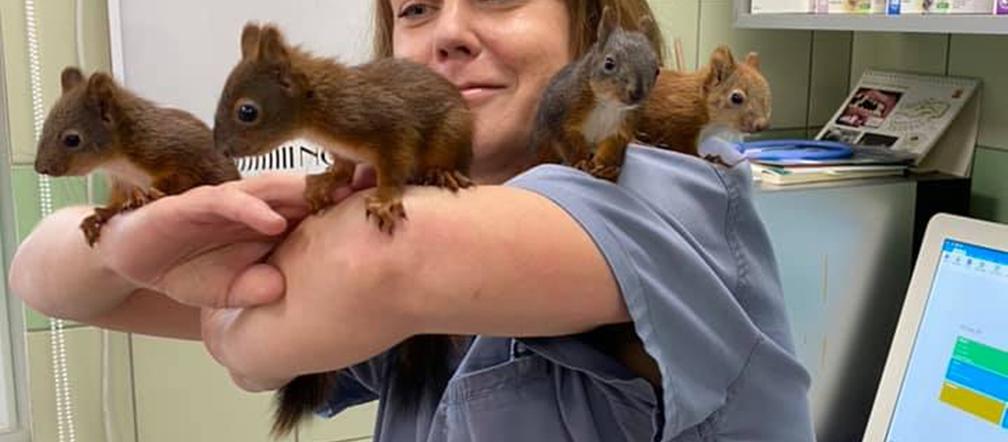 Weterynarz z Lecznicy Ada w Przemyślu Aneta Jurczuk-Andrzejuk badała malutkie rude wiewiórki podczas rutynowej wizyty. Rudzielce, to sierotki które obecnie wychowują się w przemyskim Ośrodku, bo bez mamy nie przeżyłyby na wolności ani jednego dnia. Maluchy tak lubią swoją zastępczą mamę w kitlu, że obsiadły ją i nie chciały wypuścić!