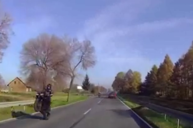 Dwaj motocykliści popisywali się swoimi umiejętnościami na DW 933 w Miedźnej. Dla jednego z nich szybka jazda skończyła się w rowie i połamanymi kręgami. Drugi za popisy na jednym kole dostał tylko mandat, miał więcej szczęścia od kolegi. Moment przed wypadkiem zarejestrowała kamera innego kierowcy.