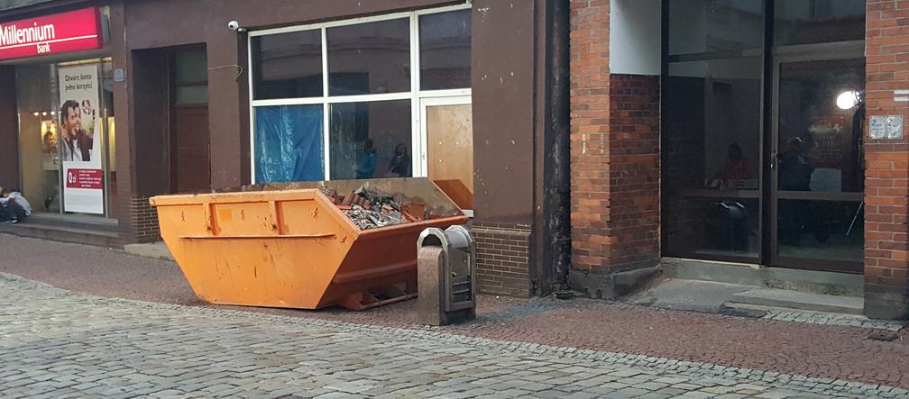 Na razie przed drzwiami budynku ustawiono kontener z gruzem, który utrudnia wejście do środka.