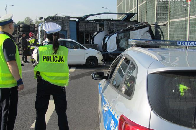 Wypadek miał miejsce na DK1 w Tychach na wysokości zjazdu na tereny przemysłowe. Kierowca ciężarówki przewożącej samochody lancia ypsilon z fabryki Fiata, stracił panowanie nad pojazdem i wywrócił ciężarówkę na bok. Z lawety spadły dwa samochody. Droga w stronę Bielska Białej jest całkowicie zablokowana. Na miejscu pracują służby. Jak się okazało kierowca ciężarówki był pijany, badanie wykazało u niego 2 promile alkoholu.