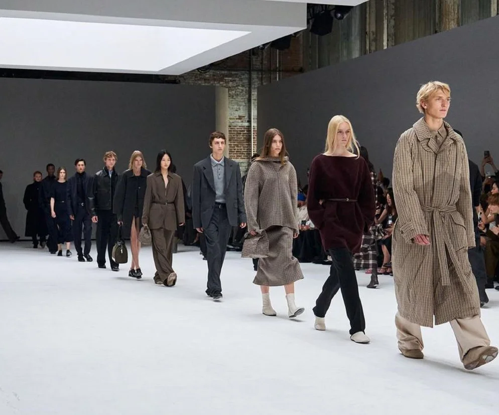 Pokaz odbył się w Greenpoint Terminal Warehouse nad brzegiem Brooklynu. Jego surowa, industrialna przestrzeń została przekształcona w scenografię eleganckiego, modernistycznego spektaklu. Monumentalna hala, przemalowana na nieskazitelną biel, zamieniła się w architektoniczną scenę, otoczoną konstrukcją z malowanego muślinu. Kiedy modelki i modele wchodzili na wybieg pewnym i spokojnym krokiem, świetlne boksy zmieniały swoją barwę — z miękkiej, ciepłej poświaty na czystą, jasną biel. Ta świetlna choreografia wydobywała siłę i naturalny szyk 47 wyjątkowych stylizacji.