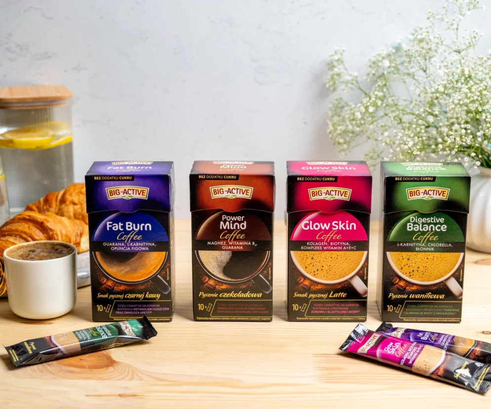 Nowa linia Big-Active Coffee to cztery propozycje, z których każda odpowiada na inne potrzeby, pozwalając na idealne dopasowanie produktu do indywidualnych oczekiwań. Tym, co je łączy, jest unikalna formuła: wysoka zawartość kawy, gwarantująca głęboki, pobudzający smak, brak dodatku cukru oraz kompozycja starannie dobranych składników aktywnych. Całość zamknięta jest w wygodnych, pojedynczych saszetkach, dzięki czemu swoją ulubioną kawę funkcjonalną można mieć zawsze przy sobie – w pracy, na uczelni, w podróży.