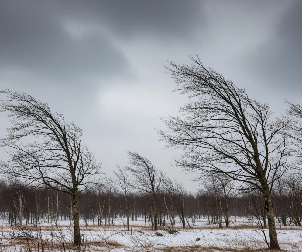 Autor: Redakcja Informacyjna AI/ Wygenerowane przez AI Na pierwszym planie widoczne są cztery bezlistne drzewa z ciemnymi, cienkimi gałęziami, z których dwa po prawej stronie są wyraźnie pochylone w lewo, co sugeruje silny wiatr. Całe podłoże pokryte jest warstwą śniegu, przez którą gdzieniegdzie przebija sucha, brązowa trawa i krzewy. W tle rozciąga się gęsty las z licznymi, smukłymi drzewami o ciemnych pniach i gałęziach, niektóre z nich z jaśniejszą korą. Niebo jest pochmurne, w odcieniach szarości, z wyraźnym gradientem od ciemniejszego szarego w górnej części do jaśniejszego, prawie białego, bliżej horyzontu.