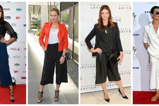 Znane gwiazdy pokochały kuloty, czyli szerokie rybaczki. Ten model spodni to ostatni krzyk mody, ale niestety nie pasuje do każdej figury. Aby dobrze wyglądać w kulotach, trzeba mieć długie i szczupłe nogi. W przeciwnym wypadku koniecznie trzeba założyć do nich wysokie szpilki (bez wiązań). Powód? Długość nogawek kulotów optycznie skraca nogi, więc figura nie wygląda korzystnie w takim fasonie. Nie ryzykuj i nie noś kulotów do płaskiego obuwia. Zrezygnuj też z botków, które też skracają nogi. Joanna Horodyńska, Zosia Ślotała czy Karolina Malinowska wyglądają świetnie w kulotach!