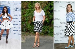 Ubrania w kropki i grochy dają duże pole do popisu i możliwość stworzenia stylizacji retro. Do tego jest to jeden z najmodniejszych wzorów tego sezonu, o czym doskonale wiedzą znane gwiazdy. Klaudia Halejcio, Grażyna Torbicka i Kamilla Baar chętnie stawiają na ubrania z kropkami i grochami w rolach głównych. Klaudia Halejcio wybrała biały krótki top i białą rozkloszowaną spódnicę w ten sam wzór czarnych grochów. Grażyna Torbicka postawiła na skromny zestaw białej bluzki i spódnicy w duże, czarne grochy. Najlepszą stylizację zaprezentowała Kamilla Baar. Aktorka odważnie połączyła błętkiną bluzkę w niebieskie grochy z białą spódnicą w czarne grochy. Wyszło świetnie! A wam który zestaw najbardziej się podoba?