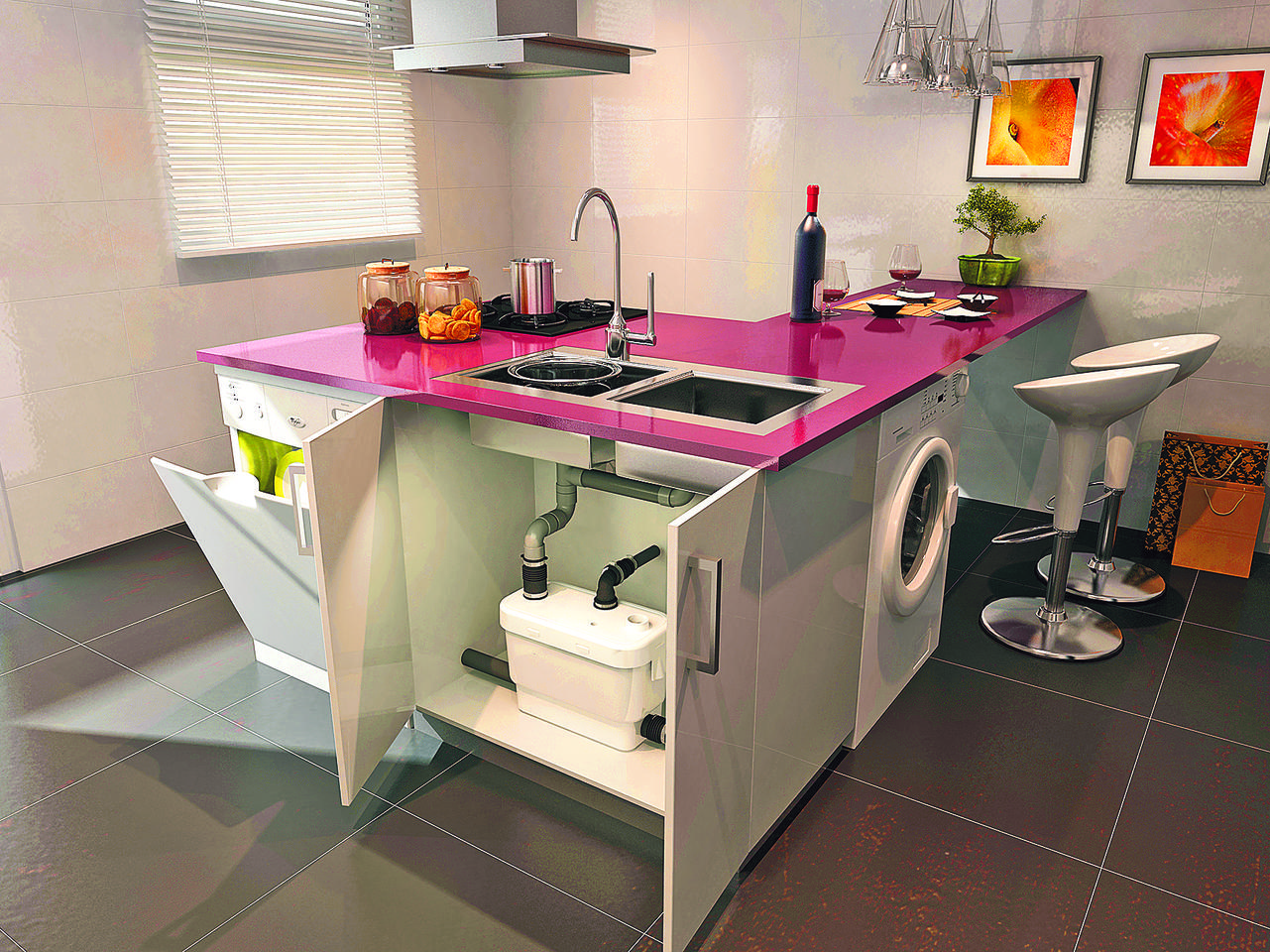 Pomporozdrabniacz daje nam możliwość stworzenia nowej łazienki, kuchni czy pralni w pomieszczeniach wcześniej do tego nieprzystosowanych i znacznie oddalonych od pionów kanalizacyjnych. Możemy zaaranżować pralnię czy kuchnię letnią w piwnicy, a na łazienkę z pomieszczeniem do fitnesu zaadaptować pomieszczenia na poddaszu. Pomporozdrabniacz pozwala na budowę wyspy kuchennej w mieszkaniu czy domu oraz brodzika z kratką ściekową w posadzce. Aranżujemy sobie nasze pomieszczenia tak, jak nam to odpowiada, a ograniczeniem jest niemal tylko nasza wyobraźnia.