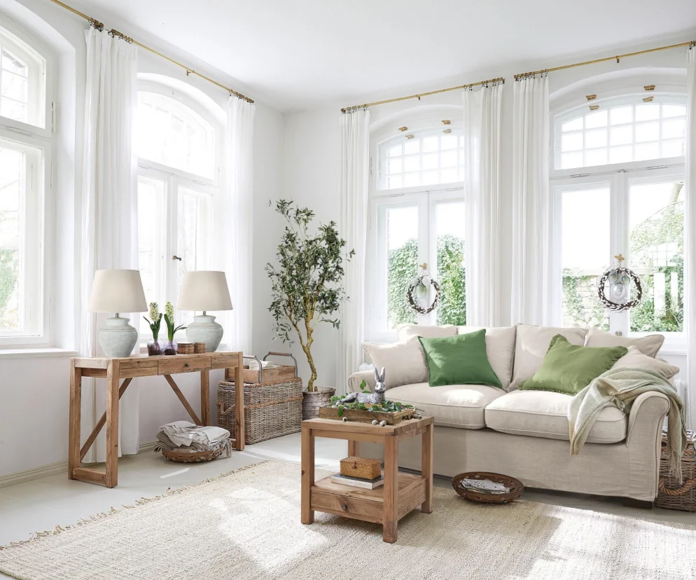 Haftowane obrusy i lniane zasłony z motywami kwiatów i motyli wprowadzają domową atmosferę i ciepło. Uzupełniają je eleganckie naczynia, ręcznie dmuchane szkło, podstawki z żeliwa oraz kosze i tace idealne do wielkanocnych aranżacji stołu.