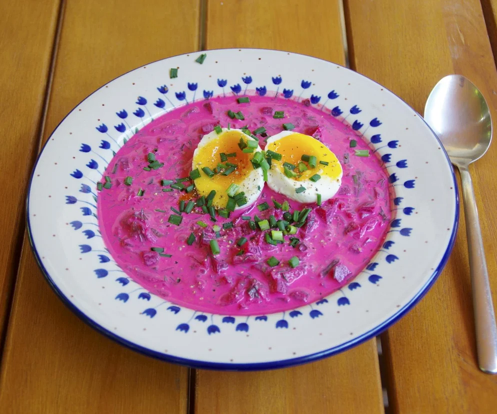 Jeśli masz ochotę na chłodnik, ale nie masz czasu gotować botwiny lub buraków, możesz wykorzystać gotowy zakwas buraczany. Dokładnie taki, jakiego używa się do gotowania wigilijnego barszczu. Na dwie porcje chłodnika potrzebujesz: 500 ml zakwasu z buraków, 400 ml jogurtu greckiego, 250 ml śmietany 18%, 2 średniej wielkości ogórki małosolne, 4 rzodkiewki, pęczek koperku, 2 ugotowane na twardo jajka, sól i pieprz do smaku. Ogórki oraz rzodkiewki zetrzyj na tarce, koperek posiekaj. W dużej misce zmieszaj jogurt, śmietanę, zakwas, starte warzywa oraz koperek. Dopraw solą i pieprzem. Chłodnik, jak wskazuje nazwa, powinien być podawany zimny, dlatego włóż zupę na 20 minut do lodówki (nie musisz tego robić, jeśli składniki były dobrze schłodzone przed zmieszaniem). Jajka obierz ze skorupki, przekrój na pół. Gdy chłodnik będzie wystarczająco zimny, rozlej na głębokie talerze, na każdym ułóż ugotowane jajka. Gotowe.