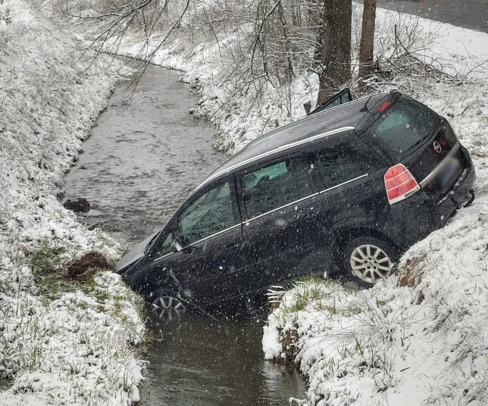 Polna. Opel wpadł do potoku po zderzeniu z innym pojazdem. Strażacy ewakuowali uwięzionego kierowcę