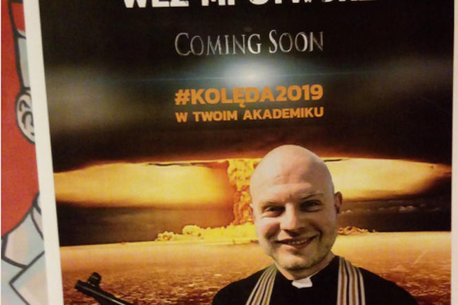 O co w tym wszystkim chodzi? Duszpasterstwo Akademickie św. Józefa chciało w ten sposób zachęcić studentów do przyjmowania kolędy w toruńskich akademikach. Na zdjęciu ojciec Maciej Ziębiec i... pistolet maszynowy na tle grzyba atomowego. Trzeba przyznać, że zgodnie ze starą zasadą "nie ważne jak mówią, ważne, że mówią" - kampania odniosła sukces.