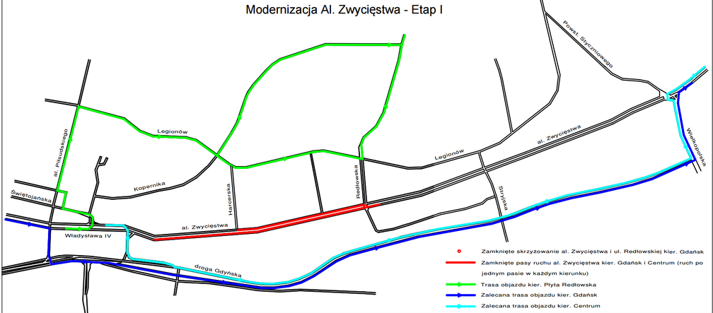 W oficjalnym komunikacie dla tej inwestycji czytamy: "Podczas trwania remontu w I etapie jezdnie w obu kierunkach będą zawężone do jednego pasa ruchu (zamknięte będą pasy wewnętrzne). Planowo prace mają trwać około 3 tygodni. W II etapie, który rozpocznie się po 22 listopada, zamknięty zostanie zewnętrzny pas jezdni w kierunku Gdańska. Niemożliwy będzie skręt w lewo z al. Zwycięstwa w ul. Redłowską oraz wyjazd z ul. Redłowskiej na al. Zwycięstwa w lewo, w kierunku Gdańska"