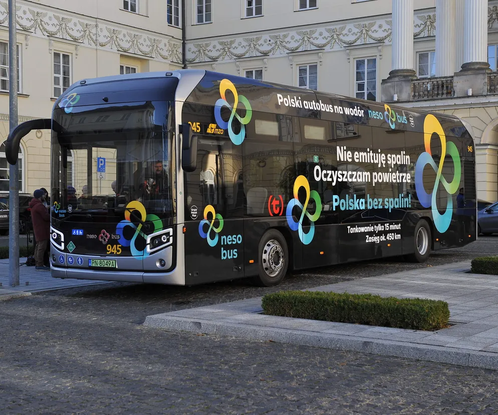 Testowany przez MZA autobus nosi nazwę NesoBus. - Skąd ta nazwa? Zagadka jest bardzo prosta. Od pierwszych liter: Nie Emituję Spalin, Oczyszczam – wytłumaczył podczas konferencji prasowej Maciej Stec, wiceprezes ds. strategii Grupy Polsat Plus, która zainwestowała w produkcję autobusów wodorowych w Polsce. Według deklaracji producenta NesoBus zużywa średnio 8 kg wodoru na 100 km. Nie emituje spalin, oczyszcza powietrze, a jedyne, co emituje to para wodna. Jego silnik jest elektryczny. Wytwarza prąd na bieżąco z zatankowanego wodoru przy użyciu ogniwa paliwowego. - Posiada własną „minielektrownię”. Fizycznie wodór ze zbiornika łączy się z tlenem pobranym z powietrza i wytwarzana jest energia elektryczna napędzająca silnik – dodał Maciej Stec podczas przejazdu autobusem ulicami Warszawy, który odbył się wraz z prezydentem Trzaskowskim, urzędnikami z Zarządu Transportu Miejskiego i dziennikarzami.