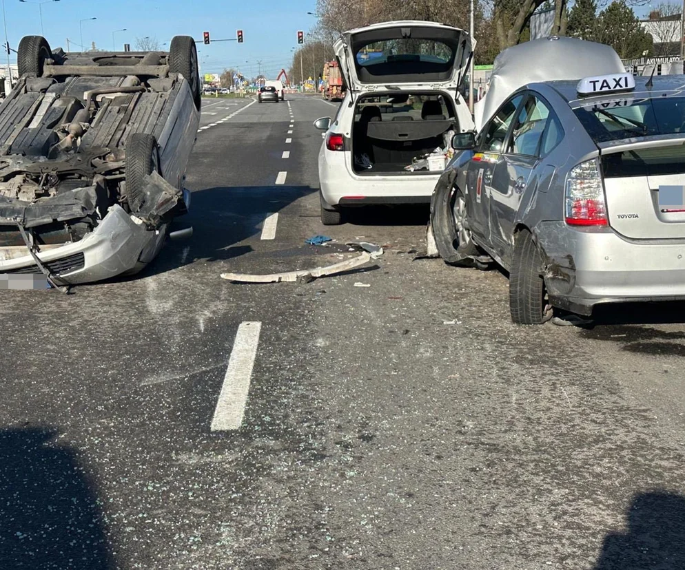 Totalna demolka na drodze. Trzy samochody rozbite, jeden dachował