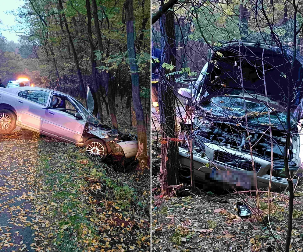 Makabra w Domanicach. Dwie osoby ranne, drzewo skończyło jazdę w rowie