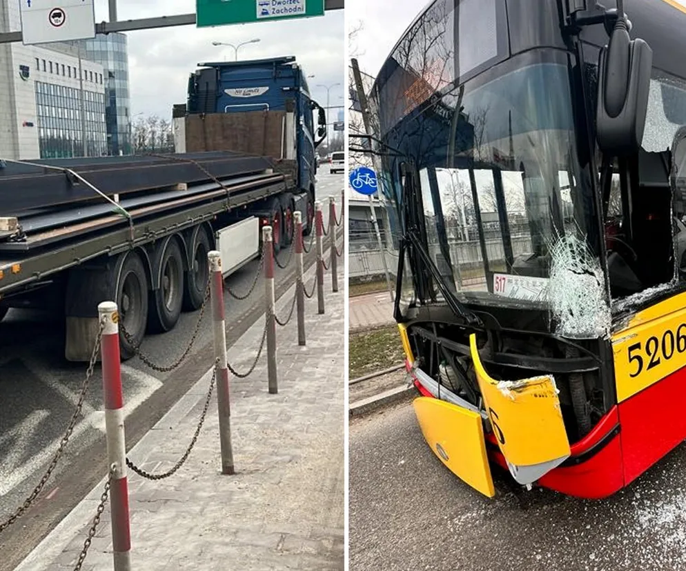 Warszawa, al. Jerozolimskie. Zderzenie autobusu miejskiego z ciężarówką