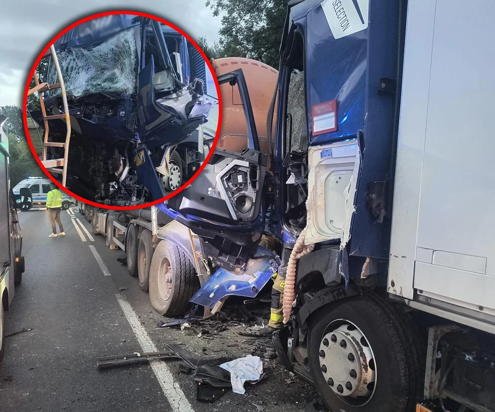 Imielnica. Trzy ciężarówki rozbite. Kierowca zakleszczony. Strażacy musieli użyć specjalistycznego sprzętu