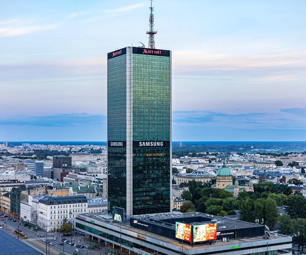 Pięciogwiazdkowy Warsaw Marriott Hotel został otwarty w 1989 roku. Posiada 523 pokoje i przez lata gościł wielu znamienitych gości odwiedzających Polskę, w tym polityków, biznesmenów i gwiazdy show biznesu oraz kilku prezydentów Stanów Zjednoczonych. Ostatnim z nich, który odwiedził budynek, był Joe Biden, który w marcu 2022 roku odwiedził Warszawę.