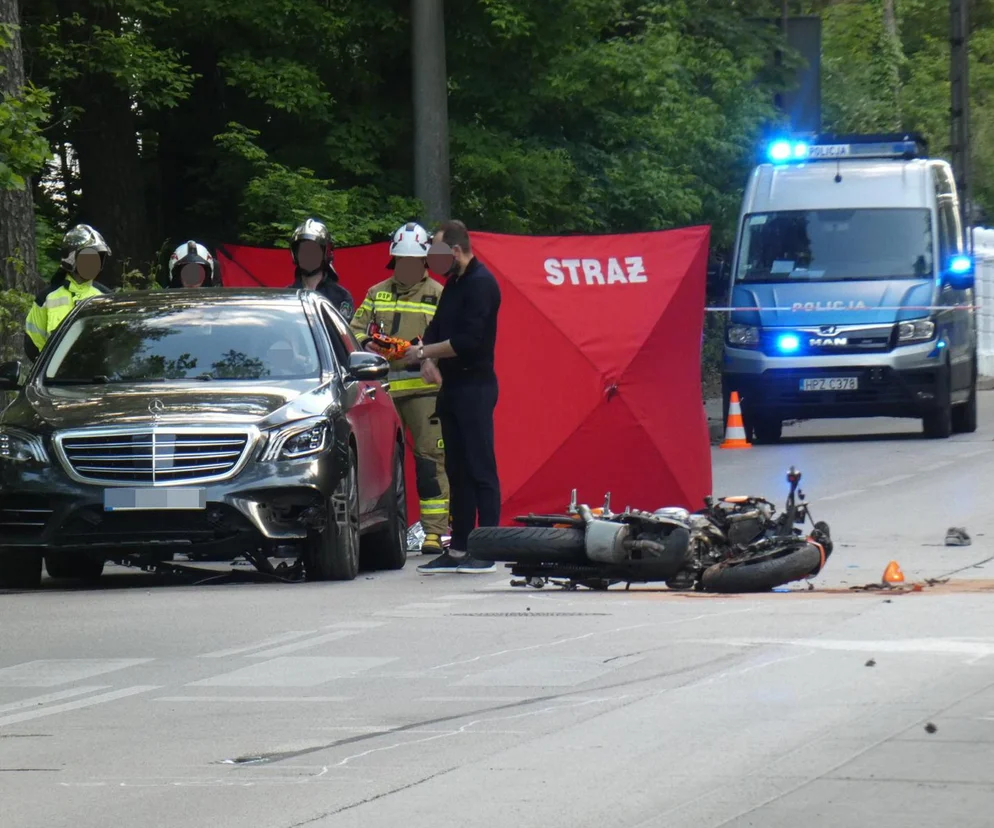 Rozdzierający serce wypadek wydarzył się w słoneczne popołudnie na ul. Wareckiej. Dochodziła godz. 16, gdy motocykl wjechał w skręcające porsche. Maszyna odbiła się od sportowego auta i siłą rozpędu wpadła w nadjeżdżającego mercedesa.