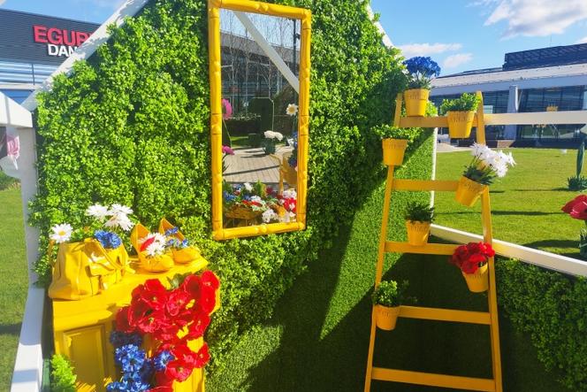 Do ogrodu gigantycznych kwiatów prowadzi brama przystrojona białymi, ogromnymi stokrotkami, a na jego terenie, oprócz widowiskowych roślin, znajduje się również strefa motyli oraz tematyczne instaboxy. Jeden z nich w całości udekorowany jest kolorowymi główkami kwiatów, z kolei w drugim dominują intensywne kolory wiosny w towarzystwie akcesoriów ogrodowych oraz żółto-zielonych roślin. Dodatkowo na tyłach instaboxów powstały dwie duże ścianki zdjęciowe, ozdobione wielkimi kwiatami. Równie ciekawym miejscem do zdjęć jest ogród różany z romantyczną bramą. Wszystkie te elementy stworzyły niezwykłą scenografię, idealną do pamiątkowych zdjęć. Ogród gigantycznych kwiatów można odwiedzać bezpłatnie do 5 czerwca br. w godzinach otwarcia centrum.