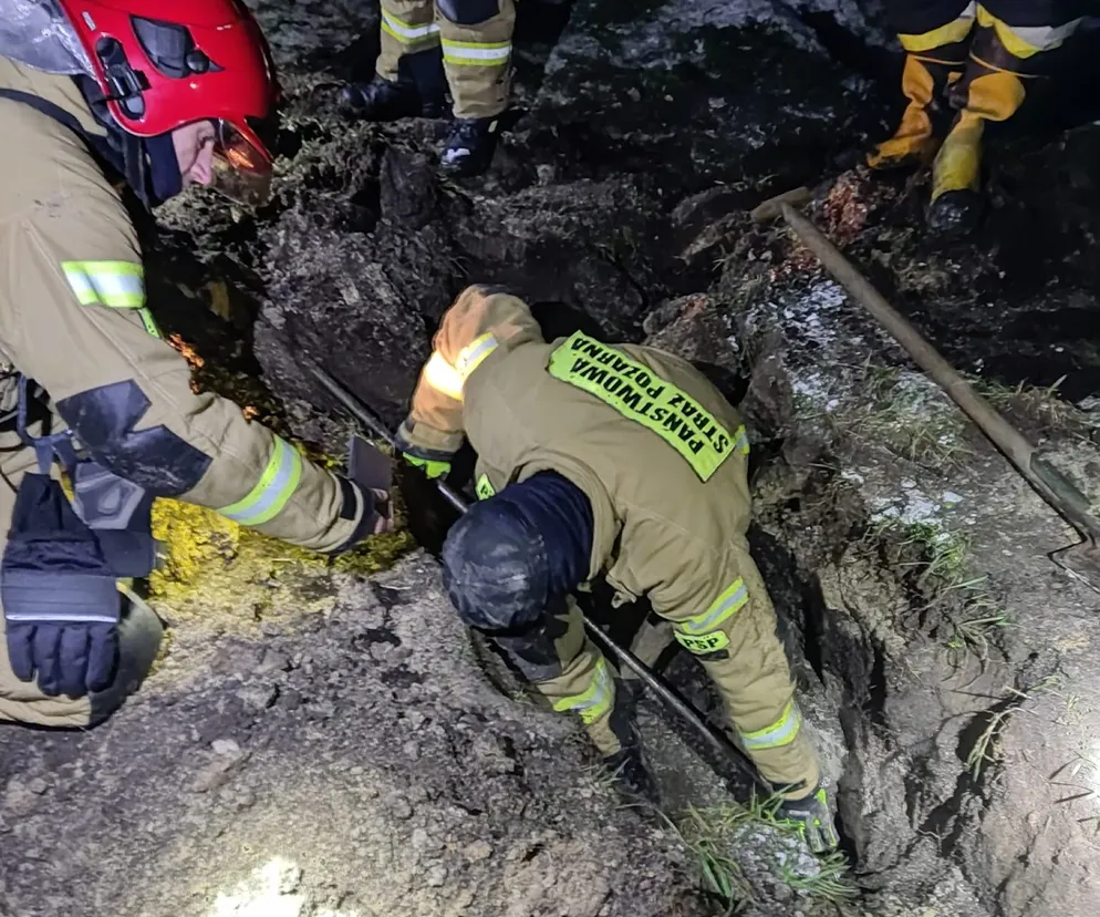 Na miejsce natychmiast wezwano strażaków z Siedlec, Mordów i Wielgorza, którzy kamerą termowizyjną potwierdzili w długiej i wąskiej szczelinie obecność małego pieska. Zwierzak zaklinował się w kilkumetrowej bobrzej norze! Szczeniak nie mógł się z niej wydostać o własnych siłach.