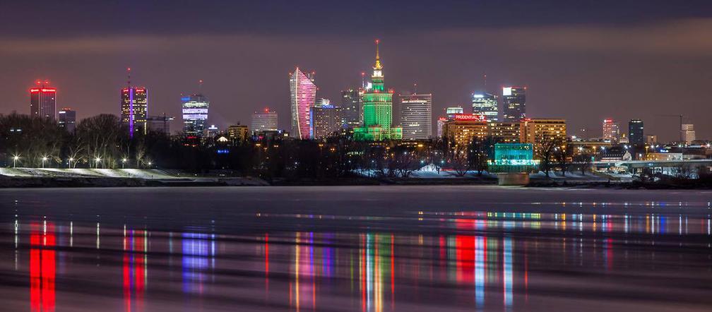 Wieczorna Warszawa czaruje kolorami, które odbijają się w Wiśle.