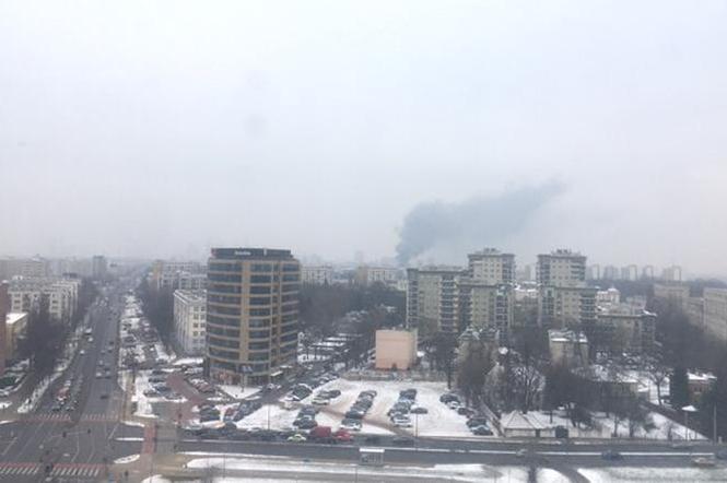 Na ulicy Racławickiej 9 w płomieniach stanął dach zakładu samochodowego. Kłęby dymu widoczne są z wyższych pięter budynków na całym Górnym Mokotowie.