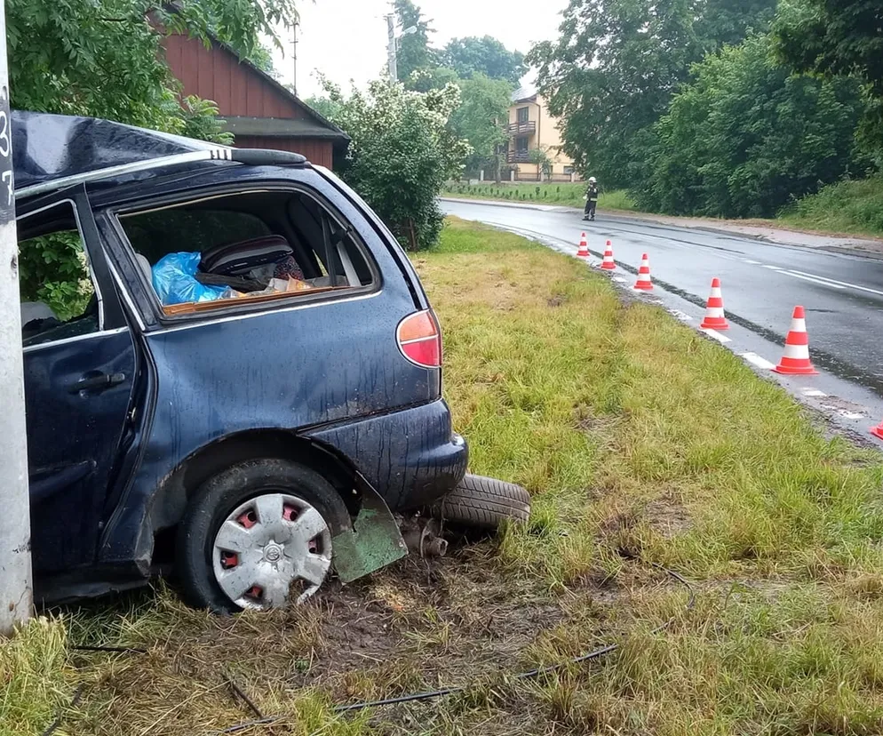 Do groźnego wypadku doszło w niedzielę (18 czerwca) popołudniu. Dwaj mężczyźni w wieku 61 i 71 lat jechali fordem galaxy droga wojewódzką 811. Wcześniej padał deszcz droga była mokra. Nagle kierowca stracił panowanie nad samochodem. Ich auto posunęło bokiem i wyleciało na trawiaste pobocze. Na ich drodze był niestety słup energetyczny. Auto z wielką siłą uderzyło w niego bokiem. Gdy na miejsce przyjechały służby ratunkowe, dwaj mężczyźni byli nieprzytomni. Po wydobyciu och z roztrzaskanego pojazdu trafili do szpitala.