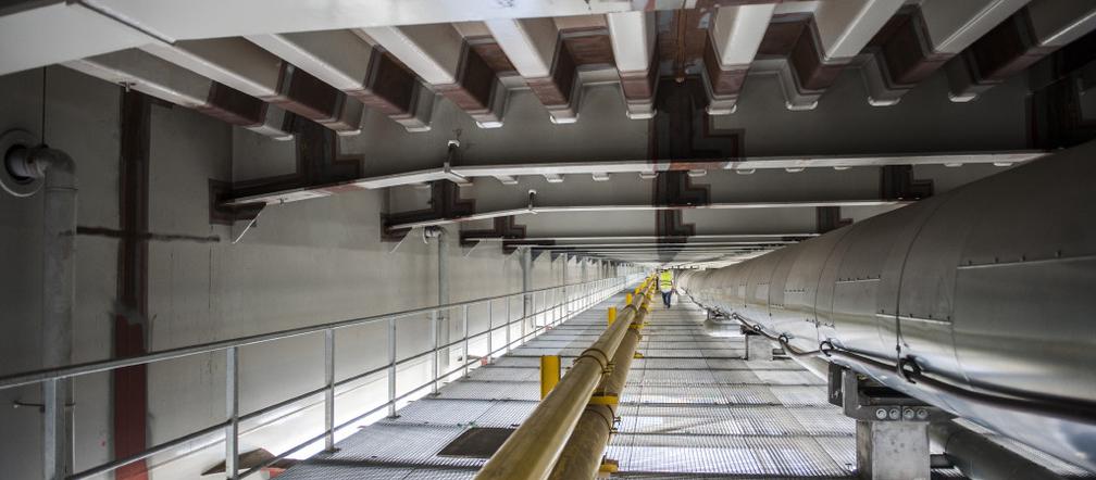 Zdjęcia udostępnił Zarząd Dróg Miejskich. Na fotografii powyżej widać pomost wewnętrzny, na wysokości pierwszego przęsła nad wodą - od strony Śródmieścia. - Po lewej stronie biegną dwie rury gazowe, po prawej widać jedną z dwóch rur ciepłowniczych o średnicy wewnętrznej DN 900, pokrytą izolacją oraz blachą ochronną. Za nimi poprowadzona jest jeszcze sieć wodociągowa o średnicy DN 1000 -